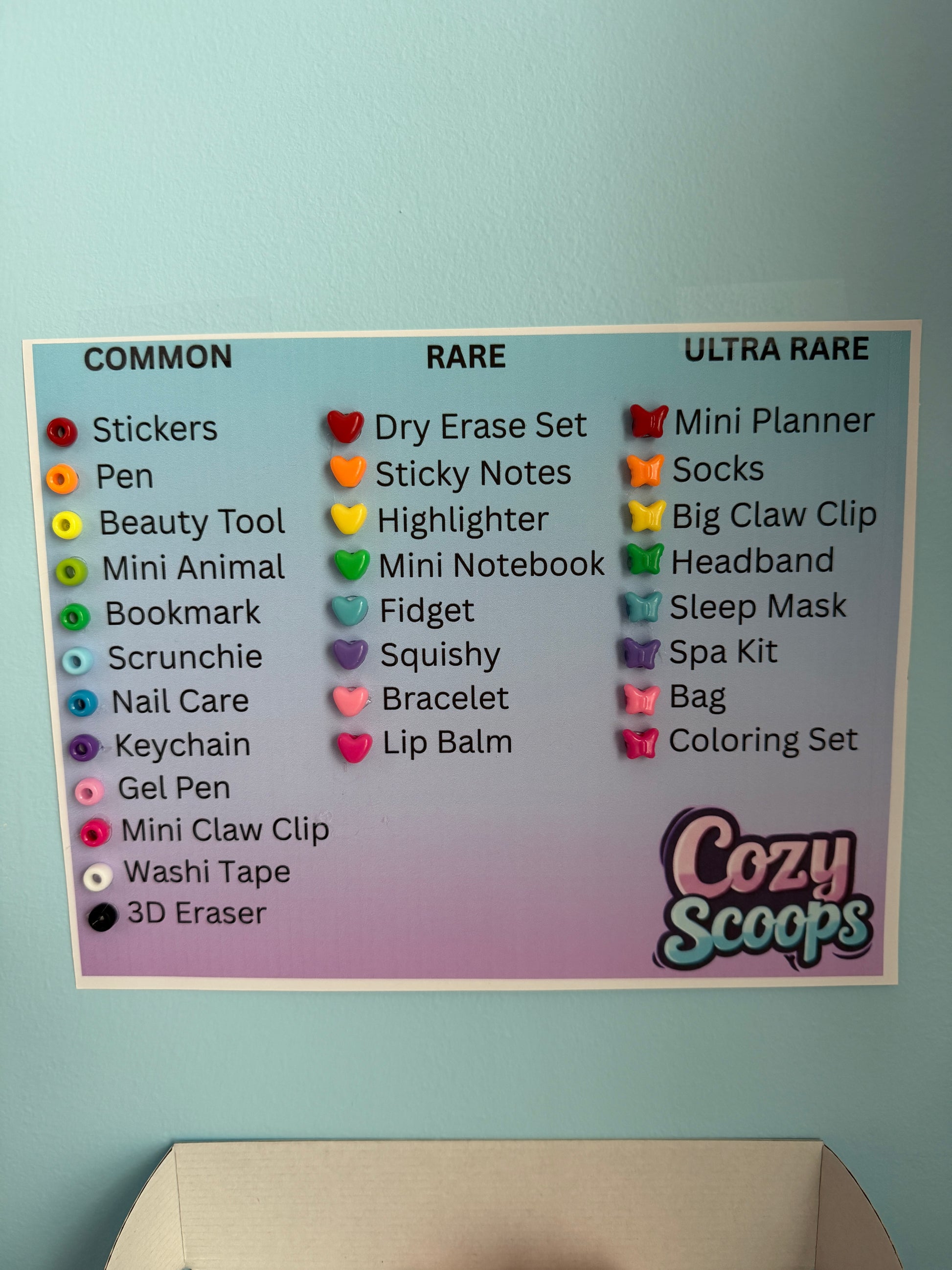 Each Mystery Scoop includes approx 17-22 surprise goodies like cute pens, stickers, mini notebooks, highlighters, bracelets, makeup bags, sleep masks, spa headbands, mini planners, slow-rise squishies, and much more!