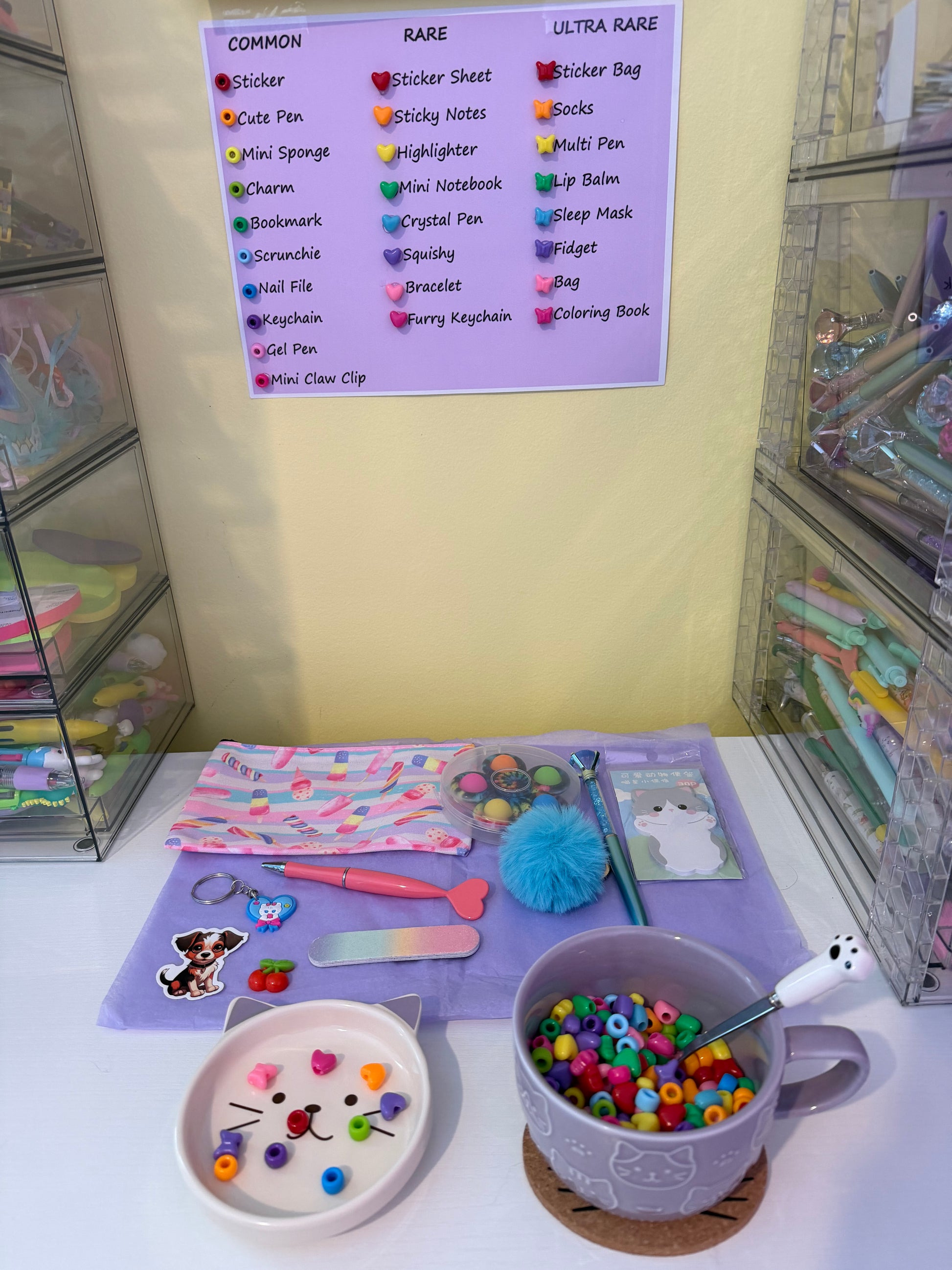 - Possible items include: cute pens, stickers, mini notebooks, highlighters, bracelets, makeup bags, sleep masks, mini nail files, slow-rise squishies, and more!